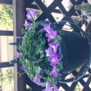 カンパニュラ メリーベル🌸🌸 綺麗なムラサキに一目惚れ😍💕🎶✨お花がひとつひとつベル🔔の形になっていてそれがまた可愛い。。😭💕💕💕薄紫に似合う、春らしい白いブリキの植木鉢も購入😋🎶春ですねえ〜🎶