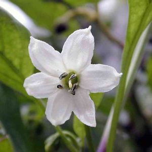 【シシトウ(獅子唐)】 中南米原産、ナス科多年草 トウガラシやピーマンと同じ仲間。 6弁の白い小さな星型花を咲かせる。 花色:白または薄黄色 開花時期:6~10月 高さ:40 ~ 60cm 花径:1 ~ 1.5cm 自宅の小さな庭にて