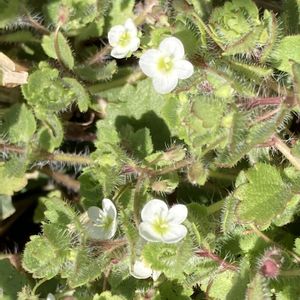コゴメイヌノフグリ オオバコ科クワガタソウ属 花友さんからのお花情報に 飛んで見に行ってきました🙌😃 オオイヌノフグリよりも 一回り小さい花冠は丸っこくて🤍 真っ白で基部が淡黄色でした🤍 葉には長毛がありフラサバソウにも似ていました🤍 *花径は6〜7mm *花柄(果柄)が葉の長さより長い (フラサバソウは同長) *茎の幅より長い開出毛がある *葉に毛が多い *鋸歯は3〜5対 (フラサバソウは2〜4対)