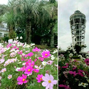 ピンクのコスモス💕 ヤシの木や展望灯台シーキャンドルを背景に🌴 江の島 サムエル・コッキング苑にて。