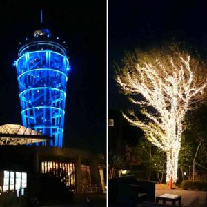 イルミネーション💎『湘南の宝石』💎(11/23~) 苑内で見かけた展望灯台シーキャンドルのイルミネーション『光の大空間』テスト点灯中の様子です✴ 本番は11/23から🎵楽しみです💓 下はクリスマスの流木の寄せ植えです🎄🎅🎁 江の島 サムエル・コッキング苑にて。