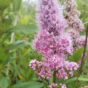 「ホザキシモツケ」 ハナアブの類がご飯たべに来ています。一つ一つの花に長めのおしべが約50個あるそうで、それが「ほぁほぁふわふわ」に見える要因。
