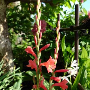 花径は3cm程度、グラジオラスの様な咲き方です。確かに5年ほど前に球根で植えましたが名札が飛んでしまって😢・・・。 教えて下さい。よろしくお願い致します。