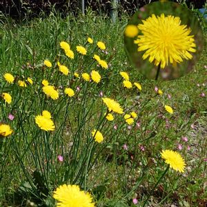 近所の空き地の「ブタナ」。タンポポモドキなんて時代も有ったような。 ピンクの小花は「夕化粧」です。もう夏ですね。