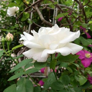 真っ白な薔薇が無傷で咲きました。雨風の影響が少なく、とても綺麗です❣️。 白い薔薇は難しいですね😁。 良い一日を❗✌️。