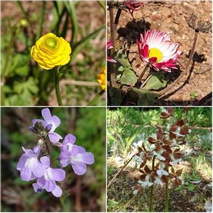 今日のお散歩。🚻🚻🚻💨を避けて近所の公園巡り。 ↖️ナンキュラス ↙️マツバウンラン ↗️リビングストンデージー ↘️エビネ 🎵どの花観ても可愛いな🎶❣️。