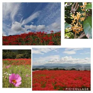 九品寺(奈良) 彼岸花が見頃で週末色々廻って来ました(人 •͈ᴗ•͈) ベトナムの方かな?が沢山いらしていて楽しそうに写真を撮っていました(人 •͈ᴗ•͈) 暫くボーッとしていると何だか愛らしい羽根の生えた生き物の様な雲が(◍•ᴗ•◍)❤ そして良い香りにつられて歩くと金木犀の花が咲いてました。 そして彼岸花の向こうにはコスモスが( ꈍᴗꈍ) すっかり秋の気配、と思ったら日曜はとても暑くて汗だくになりました(>0<;)