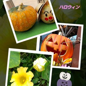 カボチャです☺️ カボチャの花は昨年我が家で育てたカボチャの花です☺️ ハロウィンのカボチャ🎃は、9月の終わりにもう飾ってあったので🤭