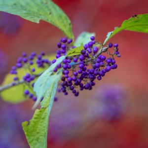 ムラサキシキブがモミジの紅葉を背景に、しっかり色づいていました。小鳥さんたちが啄ばむ前に撮りました。2024.12.05.