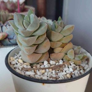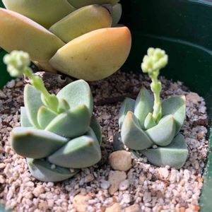 紀の川 昨年カット挿ししてから徒長させずにムチムチ成長して 初花芽も見えました😚 根元の葉挿し赤ちゃんもかわいいな~