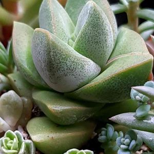 「クラッスラまとめ植え」から 目立つ巨大種が2個 🍂コルデタ クラッスラ属 変わった大きめのツブツブ付きの葉がフリフリ 横から脇芽が出る出る💦 子株共々、先端から花芽がミョーンと伸び、先に小さな蕾が ( 別写真に) 🍂紀の川 クラッスラ属 肉厚のでっかい五重の塔 どっしりとして、なんか好き💕 手前の小米星がちびっ子で可愛い😍