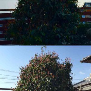 金木犀の 上:夕景 と 下:朝景 昨日夕陽に輝く新芽を見てパチリ 今朝も撮ったらこんなに違う。