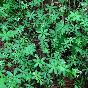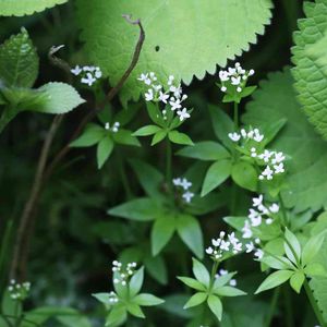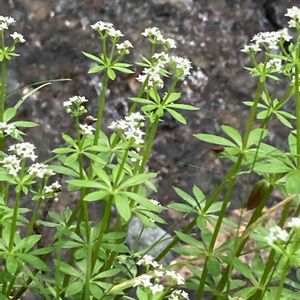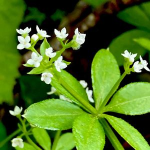 白い花は直径2ミリ位と小さく可愛く咲いています♡♡♡ 6枚の輪生した葉から茎を伸ばした先に小花をたくさん付けた花姿は愛らしいですね(*˘︶˘*).。*♡ 名前の由来は車の車輪のような輪生する葉の上に小さな花をつけることからだそうです。 アカネ科ヤエムグラ属