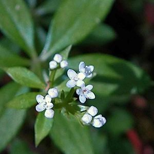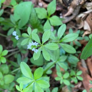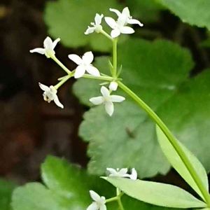 2~3ミリ位の小さな花です。花弁は4枚で珍しいです。 山道に沢山咲いていました。 クルマムグラでは? 普通葉っぱは6枚だと思いますか、写真のものは4枚しかついていません。この名前で合ってるのかな?
