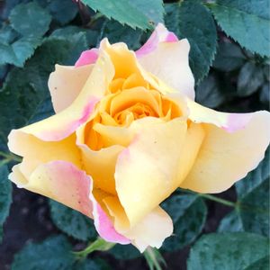 🏷水曜ローズショー🌹✨ 「フランス・アンフォ」 鮮やかな黄色の大輪 花びらに ふんわりピンクの縁どりが ふりふり♪して かわいい💕 調べたら🧐 "柑橘、ミント、カシスなどの さわやかなフルーツの香り"…らしいです。 ̋ ੯ꔷ̀͡ᓑ\クンクン したかった…😓 柳が崎湖畔公園にて