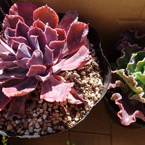 紫っ子集合part❷ フリフリな紫っ子です💜 ネオンブレーカズ✨ カンテ×シャビアナだそうで なんと親子共演です🤗 若干痩せてますが😅 日光浴するときれいな色合いになって きました〜🤗 もっとお日さん出てきてほしいなぁ( ´△`) 今日は☔️🌞が交互で多肉が出せなーい 日光浴は無理のようです。゚゚(´□︎`。)°゚