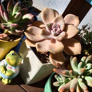 カット苗でポチった恋心ちゃん😃 寄せ植えに入れるつもりでポチったのですが、思いの外大きくてすぐに植えれず😂 しかも待機させてる間に調子崩してしまったので、そのままプラ鉢に挿したままにしてました。そのまま4ヶ月(笑) ちゃんと見たらめっちゃいい色になってる(゚ロ゚ノ)ノ✨ 最初乙女心とサイズが違うだけでしたが、この子はキレイなクリームオレンジ(鮭色)になりました:*(〃∇〃人)*: 紅葉すると違いがはっきりするんですね💕 この色ほんとにキュンとしました(艸ε≦●)♪