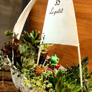 母の日のプレゼント🎁 多肉の寄せ植え♪ セリアで可愛いカエル見つけたから🐸泳がせてみました^^ ブリキは、ヨット⛵️にしたけど。゚(゚´ω`゚)゚。初心者には、難しぃー。。