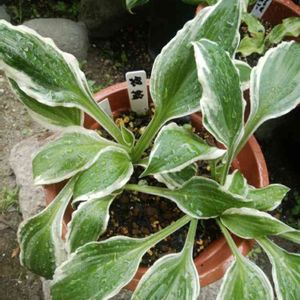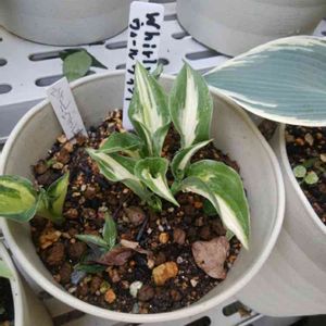 ギボウシ ファイアーワークス。‘ 花火’ 中斑だが白に緑が不規則に混じります。緑の斑が葉だけでなく葉柄の両サイドにも入り異色なホスタ。もっと増えてくれないとこのホスタの魅力出ないんだけどなー!ロイアリストの芽がわり。