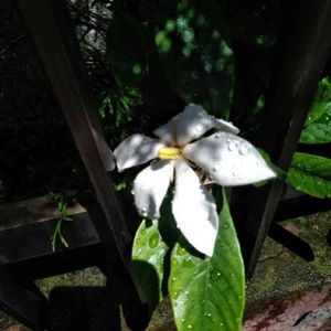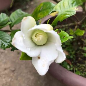 庭の鉢植えに白い花が‥ くちなしでした☘ 葉は虫が食っています☺️