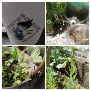 pic No1997 こんにちは🌤梅雨時期の中休み 今朝開店早々に並んで買えたとお米を夫が買って来てくれました オーケースーパーで、袋には複数品種米と記述、ノーブランド 備蓄米だわ。 どんな炊き上がりのお味になるでしょうか、明日位から食べます 午前9時台に花パトしながら発芽したのを植え替え 【1】 ↖️息子の家で使わせて貰ったコナン君柄マグカップ 裏側は後日に😌 ↗️焼酎ペットボトルの中で育つハルジオンか?ヒメジョン? 長期間夫が愛飲するメーカーのボトル底や、下部には目打ちで穴が開けられ排水も出来ることから、延び延び育つ環境って凄い ↘️↙️はバスケットプランターに 時期はずれで種蒔きしたまとめ記事掲載中のアソートパックの品種 と何だか不明な茎 【2】今日のスカビオサと思う姿 バジルの発芽芽🌱•リナリア 白色の花🤍□ 【3】多肉と紫色🟪🟣💜 【4】ピンク色の花💗💞💟💐💠 【5】 赤色の花❤🟥 *スカビオサ蕾の着いた茎を✂️室内で発根するかどうかの実験中、水と水耕用液肥を混ぜてる 土にあるスカビオサは昨年から木質化して新茎からの蕾で、写真を見ると根からの栄養補給が無いためか花びらに色素が見られない 🤣 写真撮影しながらステンレス製棚が錆びてるけど下部に蛹を発見 アゲハ🦋の蛹かな?蛾だったら嫌だな 柑橘類の葉には居なかった 茗荷の茎、午前はしっかりしていたが、花芽の茗荷は無し バジル移植植え替えはセリアの重なる鉢に二度撒いたのを全部まとめた 白花ローズマリーは全く花芽無し、二つ目の株も鉢植えにし、発泡スチロールの中の角に設置