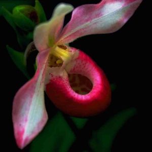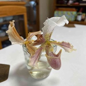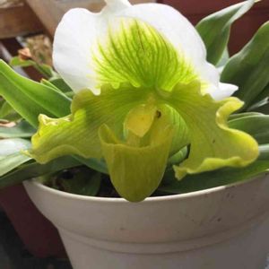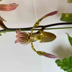 《パフィオペディラム》ラン科パフィオペディラム属 原産地は東南アジア、中国、インド。 洋ランの一種で、カトレアなどに比べ、半分ぐらいの大きさだったと思います。 名前の由来は「ヴィーナスのスリッパ」というギリシャ語に由来するそうです。 花の色は多種あり、次の投稿で、黄色をアップしますね。 このお花の特徴は、顎みたいな、袋状の花弁を付けているところです。 食中植物に見えますが、違うんですよ☺️ やや弱めの日光でも生育するそうです。