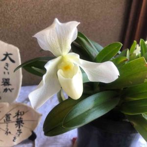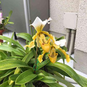 黄色のパフィオは、きれいですね✨✨ 《パフィオペディラム》ラン科パフィオペディラム属 原産地は東南アジア、中国、インド。 洋ランの一種で、カトレアなどに比べ、半分ぐらいの大きさだったと思います。 名前の由来は「ヴィーナスのスリッパ」というギリシャ語に由来するそうです。 このお花の特徴は、顎みたいな、袋状の花弁を付けているところです。 食中植物に見えますが、違うんですよ☺️ やや弱めの日光でも生育するそうです。