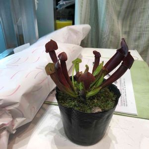 まるで食虫植物を思わせる立派な壺…ではなく花びらに魅せられ、お迎えしました。 「パフィオ 実生」と書かれた札が付いていました。 ちゃんと育てられるか、ドキドキです。