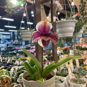 パフィオペディラム(実生)¥1380 開花株 パービセパラムタイプの交配種です。 デレナティーとアルメニアカムという原種の交配種。