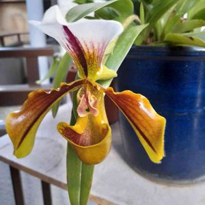 変な花が咲くパフィオペディラム 日が翳ると肌寒い 地味に花芽が上がっていたランが 開花し始めていた パフィオはいくつか育てているけど 原種のものは咲かず実生のは良く咲く よくっていっても年一 日中は20℃くらいらしいので夜取り込んだ 一部の観葉植物もベランダへ出す 朝は晴れてて過ごしやすい気温だったが 昼頃になり雲が増えると長袖シャツでは寒い 夜は10℃以下の予報だから 今日より取り込まねばならん 朝晩バタバタする季節になった そろそろ落ち葉も増えてくるかな