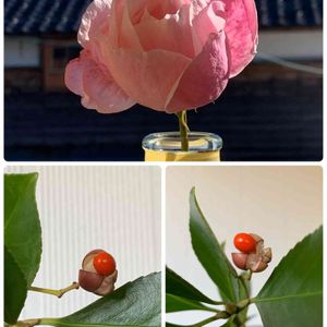 2023.1.11 クイーン エリザベスとマサキの実 何度も投稿すみません🙏 ⬆️:前日のアラレ後2022.12.15に救済した最後のツボミ 毎朝の水替えと1ミリくらいの水切りで巻きは緩 くなってきたけど、外側の花びらが開きません そろそろ散りそうです💦 ↘️↙️:2022.12.22に花友さんのアイデアで、裏庭から 摘んで来たマサキの実 同じマサキを2方向から撮りました 種が結構外に出て、そろそろ落ちそうです💞 池と堀さんありがとう😸💞