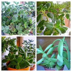 我が家の問題児😌 右上、ストレプトカーパスの葉に白い物が…カビかしら? 下、左右は来て直ぐ徒長した火祭りと熊童子 左上のクローバー🍀は良いの💖後ろの虹の玉の葉がポロポロ落ちて…(T^T) 外に出せず日光不足と暖か過ぎるものねⅱ勉強して頑張ろうo(゚∀゚)o