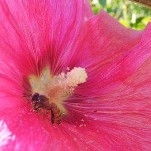 タチアオイの中の、幸せそうなセイヨウミツバチ🐝💞 花粉が一杯付いてて、めちゃ可愛いです(❁´ω`❁)