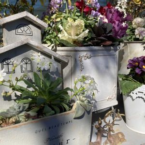 ①② 『レウイシア』 小さめの白にキュン💘 ガラクタ市でgetした 木製鉢に多肉とセダムとの寄せ植え ③ 『プリムラ』 ガラクタ市でgetしたブリキ鉢にポットイン🎶 ④⑤ 種まきっ子ビオラ