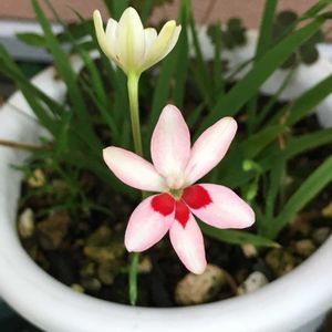 実生のヒメヒオウギが初めて咲きました🎉薄ピンクの花弁に赤いアクセントが有る品種と白花のタイプです。