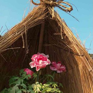 三が日に奈良の長谷寺へ 牡丹は雪よけの藁傘の中にいました😊 暖冬のせいか外は雪無く空の青と牡丹の色が綺麗でした