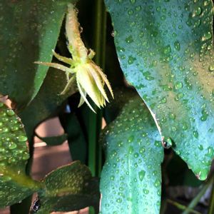 GSで沢山の月下美人を咲かせていらっしゃる方に、日光浴が好きだと聞いて鉢の場所を移動しました。 邪魔だなと思って昨日の朝葉をそっと避けたら。 えぇ?!もしかして、蕾❓‼️ いつも大きくならないと気づかないので、すごいビックリしました。 どなたか。焼酎に漬けておく保存方法を教えてください🙏🙇♀️