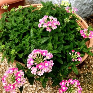 切り戻ししたバーベナが ポンポン咲き始めました😍 これから 楽しめそうです💕 実は奥にホワイトのバーベナが いるんですけど、切り戻し後、 白からうす緑に 変身してました😳 クリームソーダ系?💚 もう少し咲いたら upします📷✨