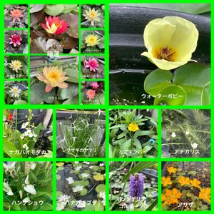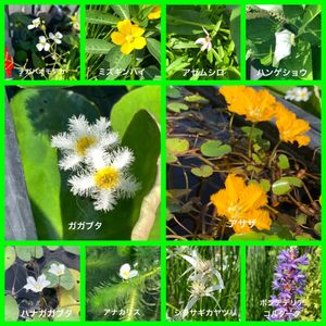 今日の水生植物達!! 左側上から 『アサザ』 『ハンゲショウ』初開花 『アナカリス』 左側二つ目上から 『ポンデデリアコルダータ』 『シラサギカヤツリ』初開花 左側三つ目上から 『ハナガガブタ』 『睡蓮』 アルバ 初開花 ジョイートモシック 初開花 インナーライト サイアムビューティー アメリカンスター 初開花 『ワスレナグサ』 右側の上から 『カキツバタ』 『ナガバオモダカ』
