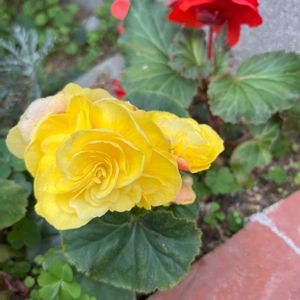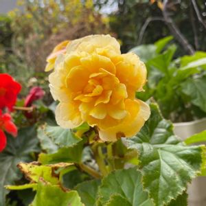 花の少ない時期ですが、ひらひらした花びらがゴージャスな球根ベゴニアがちらほらと開いています。