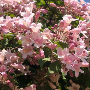 《ショウキウツギ》 花は2個ずつ対になってつき、子房が合着します。花は長さ1.5~2.5cmの鐘状漏斗形で、先端は2唇状に5裂します🌼🌸 花冠の外側が濃いピンク色、内側が淡いピンク色で喉部にはオレンジ色の網目模様があります。 名前の由来は鍾馗(しょうき)(魔を除き疫病の悪神を追い払うという神の名前を持つ☺️