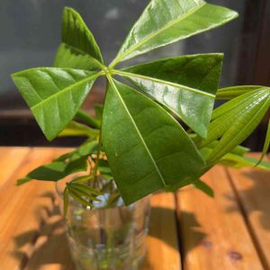 水に挿したパキラの葉っぱです(^^) そのまま発根できると良いなぁー(*^▽^*) あっ!水にメネデールを薄めて作らなきゃ!!(笑)