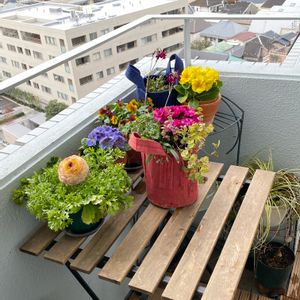 今朝のガーデンテーブル😊 このテーブルがバルコニーに来てから、立ったまま植え替えできるのでお花のお世話が本当に楽になりました💕腰が痛くなりません😆 季節が良い時はお茶もできます💕 バルコニーの立ち上がりで日陰になる面積も減りました。普段は小さい鉢🪴💐を置いて眺めています💗
