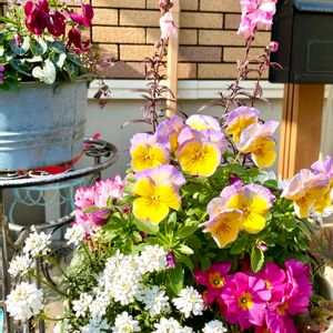 門柱横です。 ホームセンターで見つけた草花を寄せて植え付けてます^ ^ 忘れな草 198円 スイートアリッサム 混色 198円 プリムラジュリアン シルキーレインボー 198円 プリムラジュリアン 白 198円