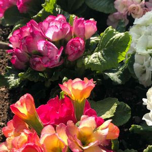 プリムラ ジュリアンです。 辺り一面に春が訪れたようなパッと明るく爽やかな色合いです。 見ているだけで、ホッと心も和みますね。 ヨーロッパ原産。日本で品種改良 サクラソウ科サクラソウ属の1年草。