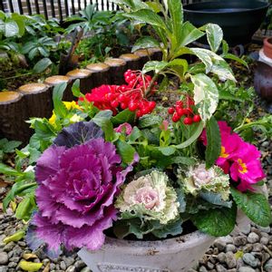 『お正月用の寄せ植え その1』 お正月らしく縁起物の葉牡丹や万両を中心に寄せ植えしました。 ちょっとごちゃごちゃしすぎたかな…。