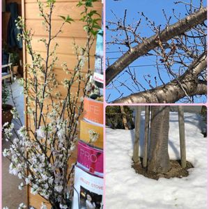 集金日です✋ 左は薪炭屋さんの啓翁桜🌸もう若葉がお出まし🍃 右は自然なままの染井吉野🌸まだまだ蕾は固いです(^_^;) 足下に⛄あるもんネ💧 空は青空☀️車内や窓越しはポッカポカ😁