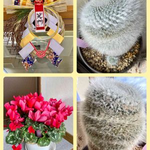 集金先の法面屋さんの入り口🤩 見た事ない注連飾り🤳✨ 稲穂🌾も黒いワォ☆Σ(・д・lllノノ ちっちゃいおしっさま(獅子)のってて可愛いや❣️ サボテンのお子様3つおっきくなってた👍 花芽はまだだった🌀