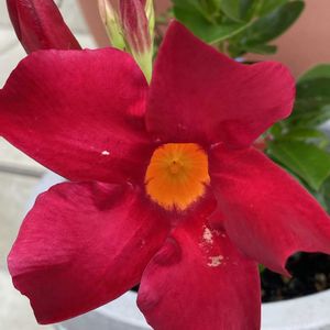 《マンデビラ〜我が家に咲きました》 キョウチクトウ科の常緑つる性植物で、中央アメリカから南アメリカ原産です🤭🌸 特徴的なのは、夏から秋にかけて咲く、赤やピンク、白などの鮮やかな花と、つるを伸ばして生長する性質です🌸🌼