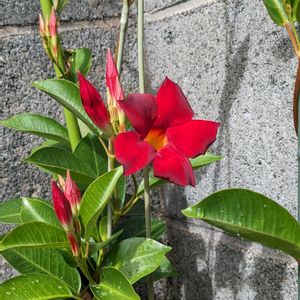 《マンデビラ》ダンディ邸の庭にて 夏から秋にかけて、白・ピンク・赤などの鮮やかな花を、ひとつの花が長く咲き、次々に開花する長く続く花期が特徴🤭 日当たりが良く水はけと風通しの良い場所を好み、乾燥気味に管理します🌼🌸
